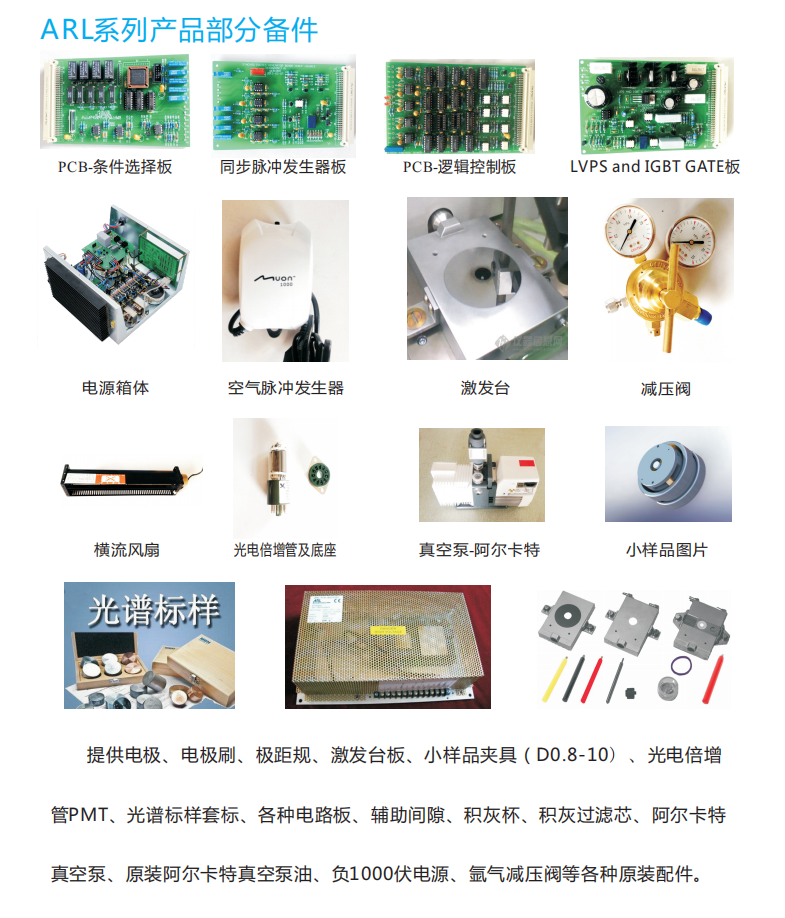 ARL直讀光譜儀配件耗材備品備件 上海鑄金分析儀器有限公司可供應(yīng)各型號(hào)ARL直讀光譜儀、ARL直讀光譜儀軟件、ARL直讀光譜儀備品備件、ARL直讀光譜儀配件耗材。如果您對(duì)ARL3460、ARL4460、ARL8820、ARL8860光譜儀(金屬分析儀)有相關(guān)需求,均可聯(lián)系鑄金。ARL直讀光譜儀備件耗材如:電極、電極刷、極距規(guī)、激發(fā)臺(tái)板、小樣品夾具( D0.8-10)、光電倍增管PMT、光譜標(biāo)樣套標(biāo)、各種電路板、輔助間隙、積灰杯、積灰過(guò)濾芯、阿爾卡特真空泵、原裝阿爾卡特真空泵油、負(fù)1000伏電源、