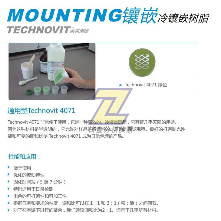 由于Technovit 4071非常便于使用,它是一種快速的、冷鑲嵌樹脂,它有著幾乎無限的用途。因為這種材料是半透明的,它允許對樣品進行適當的、原始的視覺觀察。良好的打磨拋光性能和可變的調和比使Technovit 4071成為日常包埋的理想產品。