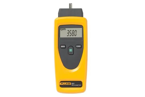 產品概述: Fluke 931 轉速計Fluke931 轉速計是一款手持式轉速計,可以準確地測量每分鐘轉數 (RPM) 或表面速度以及距離。本款轉速計集成接觸式和非接觸式兩種測速功能,使用“紅外光束功能可進行非接觸式轉速測量;如使用連接適配器和可選擇的測速頭,則可進行接觸式轉速測量。 “存儲功能允許保存最大讀數 (MAX)、最小讀數 (MIN)、平均讀數 (AV) 以及最后讀數。 光學(非接觸)測量轉速:1至99999轉/分接觸測量轉速:1至19999轉/分 精度: 0.02 % 讀數 + 1 個字 光學